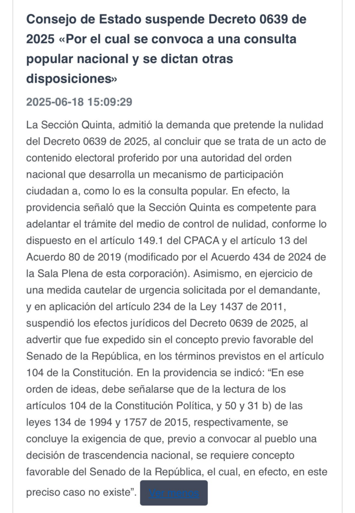 La decisión de la sección 5a del @consejodeestado de suspender el decreto 0639 de 2025 de convocatoria a la Consulta popular es un atentado grave contra el Estado Social de Derecho, es una usurpación de funciones y violenta de manera grave la institucionalidad. Según el artículo 241 constitucional numeral 3o es competencia exclusiva de la Corte definir la constitucionalidad de un decreto que convoque una Consulta popular nacional y la Corte se pronunciará sobre los vicios de procedimiento de la convocatoria, no solamente en relación con la expedición del decreto, sino sobre todo el proceso y en particular la manera como se tomó la decisión por parte del Senado el 14 de mayo de 2025. El alcance de dich+a competencia ha sido definida en las sentencias C -180/94 y C-150/15 que dieron pie a las leyes estatutarias de participación ciudadana 130 del 94 y 1757 de 2015. Por otra parte en el artículo 237 constitucional, numeral segundo se establece de manera indubitable que el Consejo de Estado puede “2. Conocer de las acciones de nulidad por inconstitucionalidad de los decretos dictados por el Gobierno Nacional, cuya competencia no corresponda a la Corte Constitucional.” Según lo argumentado el Consejo de Estado no debe usurpar las funciones que de manera exclusiva se le han otorgado a la Corte Constitucional, por tanto las demandas de nulidad sobre la sesión del 14 de mayo de 2025 en el Senado como las relacionadas con el decreto no deben ser resueltas por la justicia contenciosa administrativa y el proceso en curso en la sección 5a del Consejo de Estado debe ser enviado a la Corte Constitucional. Sobre los vicios de procedimiento en el curso de la convocatoria a la Consulta popular nacional, que afectan el derecho fundamental al debido proceso o la Consulta misma, si puede la justicia contencioso administrativa y cualquier juez que conozca de una acción de tutela pronunciarse sobre el respeto a los derechos fundamentales que resulten vulnerados, frente a ello el órgano de cierre será la Corte Constitucional cuando ejerza la potestad de revisión de una tutela. La Corte Constitucional deberá sentar jurisprudencia sobre la forma y contenidos del alcance del concepto que debe rendir el Senado conforme al artículo 104 constitucional y conforme al artículo 20 de la ley 1757 de 2015 sobre los requisitos que debe tener el pronunciamiento del Senado en torno a la conveniencia o inconveniencia de la Consulta popular, como de la discrecionalidad con la que puede actuar el Presidente al expedir un decreto de convocatoria, como el alcance de los artículos 54 de la ley 130 del 94 y del artículo 33 de la ley 1757 de 2015, cuando el Senado no rinde concepto sobre la convocatoria de la consulta. La Corte en principio no podría pronunciarse sobre los vicios de procedimiento antes de la realización de la Consulta porque declaró inexequible los apartes del artículo 53 de la ley 130 del 94 que establecía el control previo de constitucionalidad por la propia Corte, vía revisión de tutela podría resolver este galimatías. La decisión de la Sección 5a del Consejo de Estado de considerar que el Presidente sólo podría convocar la Consulta con un concepto favorable del Consejo de Estado, desconoce que el Presidente si tiene la facultad de ejercer el control de constitucionalidad que establece el artículo 4o constitucional y no aplicar una norma o un acto administrativo incompatibles con la Carta Política (sentencias C-600 de 1998 y C- 122 de 2011) así como lo puede hacer objetando proyectos de ley para no promulgar y devolverlos al Congreso, si los considera inconstitucionales o inconvenientes, artículos 165 y siguientes de la Carta Política. Por otra parte el Presidente de la República tiene como obligación primera constitucional, art. 188 de la Carta Política, garantizar los derechos y libertades de la población colombiana y uno de ellos es el de garantizar que el pueblo pueda participar frente a las decisiones que le afectan.