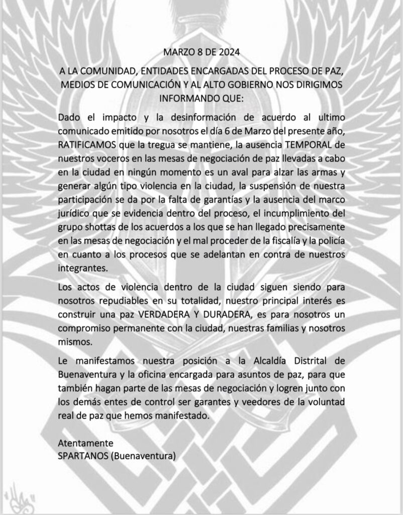 La tregua en #BuenaventuraTerritorioDePaz se mantiene, desde la delegación del Presidente de la República @petrogustavo en la mesa sociojurídica presidida por @alejoocampog y el @ComisionadoPaz @adrianaferrermj con el apoyo de la @MisionONUCol @UEenColombia manifestamos a Spartanos y Shottas que seguiremos haciendo todo lo necesario para que la paz total se afiance, para que el presente y futuro de los 200 mil niñ@s y adolescentes bonaverenses sea la certeza de la vida, la inclusión social y la dignidad, para que las comunidades afro e indígenas, las grandes empresas y pequeños emprendimientos tengan un entorno seguro en el Distrito, para que sus 42 destinos turísticos se fortalezcan, para que la alegría fluya en la certeza de que la vida vence sobre la muerte. @FranciaMarquezM @GustavoBolivar @AlexLopezMaya