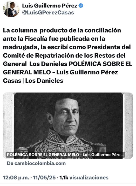 Quiero aclarar que la columna “El Prócer que si lo era” que escribí si fue publicada el día de ayer en “Los Danieles” . No se le dio el mismo despliegue a la columna de Daniel Samper Pizano @losdanieles en la que se atentaba contra la memoria del prócer José María Melo y contra la decisión del Presidente @petrogustavo de lograr la repatriación de sus restos. Sin embargo, en acuerdo con los descendientes del General Melo, declaro zanjada la querella ante la @FiscaliaCol y agradezco la voluntad de la abogada de Daniel Samper @AnaBejaranoRG de contribuir a esta conciliación, así como la disposición de conciliar del propio Daniel Samper Pizano @DanielSamperPi @DCoronell
